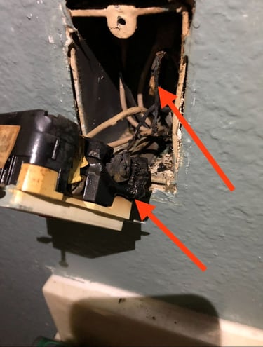 The melted outlet example we’re sharing in our post is a real-life reminder of what can happen when holiday plug-ins push a circuit beyond its limit. This one we actually encountered in a bathroom.